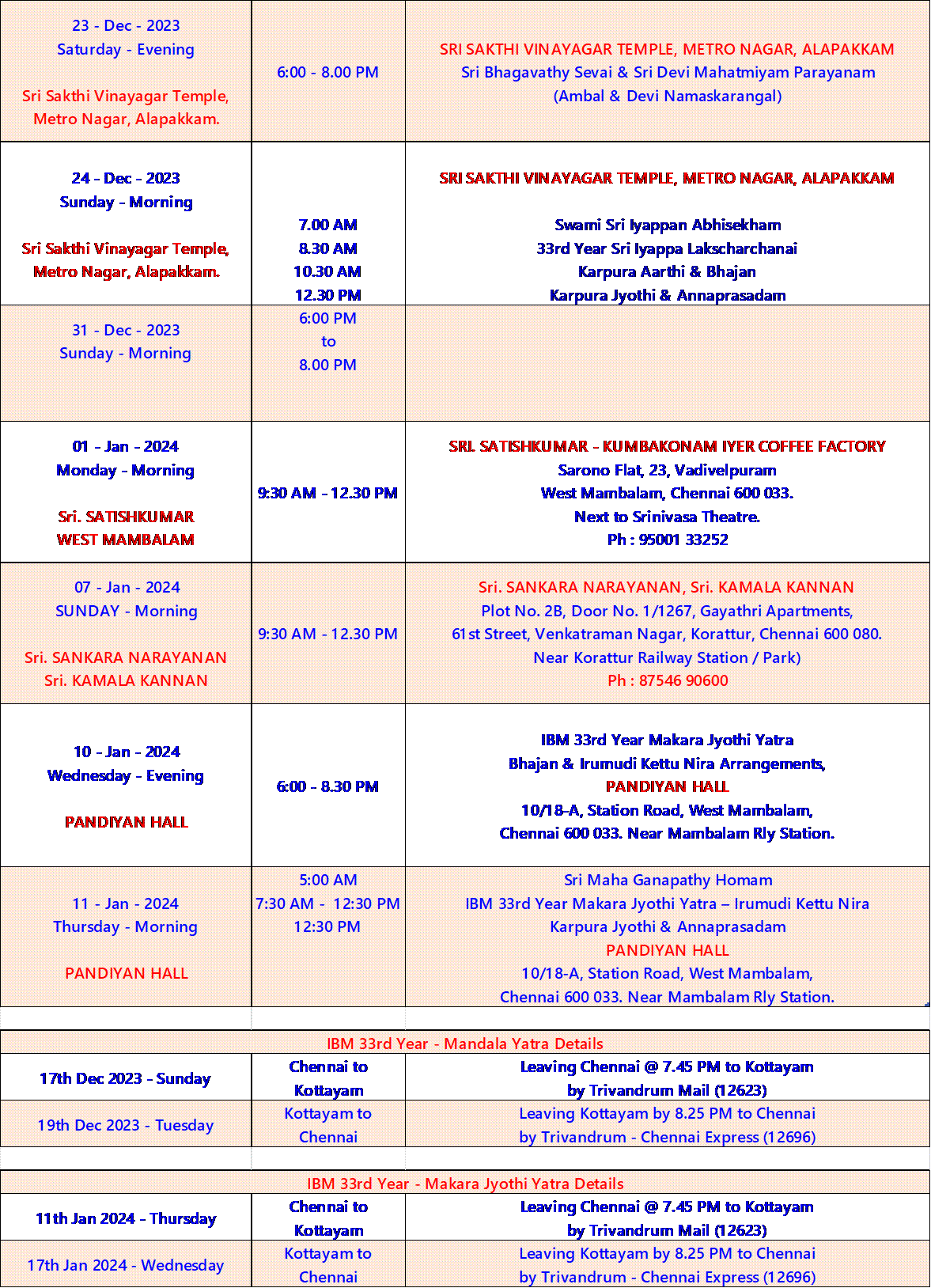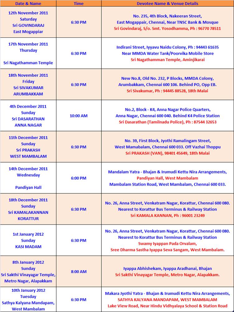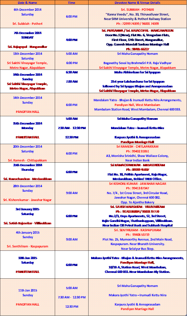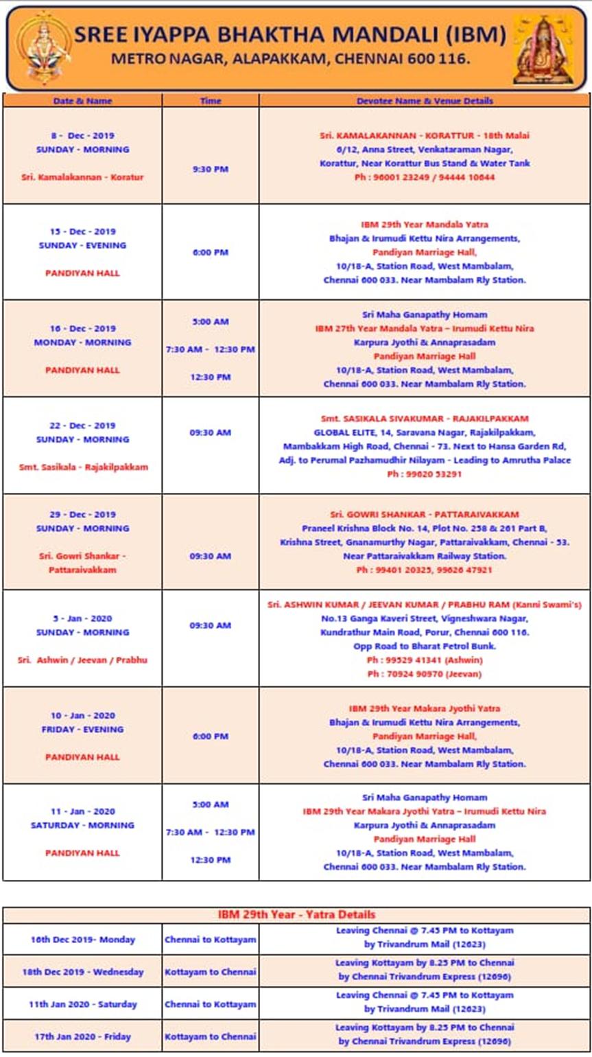 Mandalam Yatra - Irumudi Kettu Nira Arrangements Pandian Marriage Hall, 10/18-A, Station Road, West Mambalam, Chennai 600 033. Near Mambalam Rly Station. |