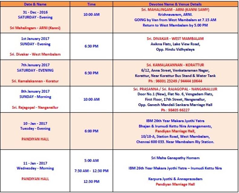 Sri Maha Ganapathy Homam Makara Jyoti Yatra Irumudi Kattu Nira Pandian Marriage Hall, 10/18-A, Station Road, West Mambalam, Chennai 600 033. Near Mambalam Rly Station. |