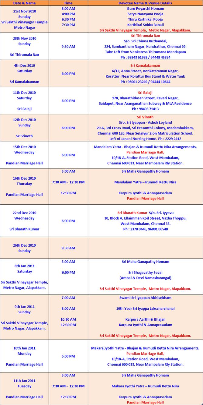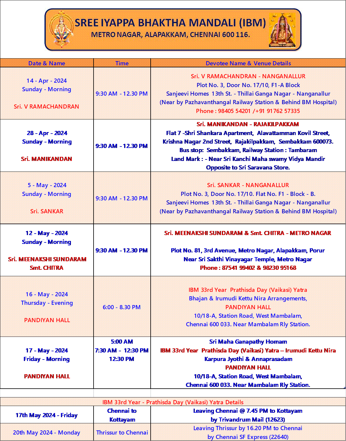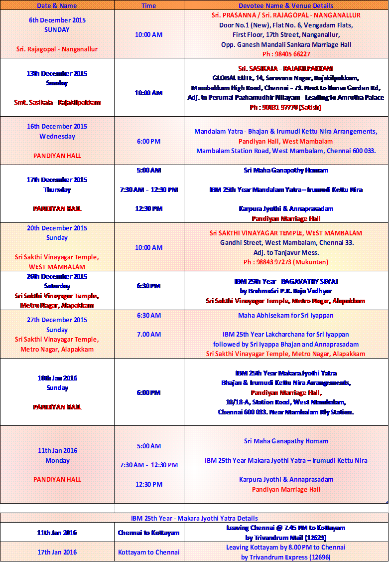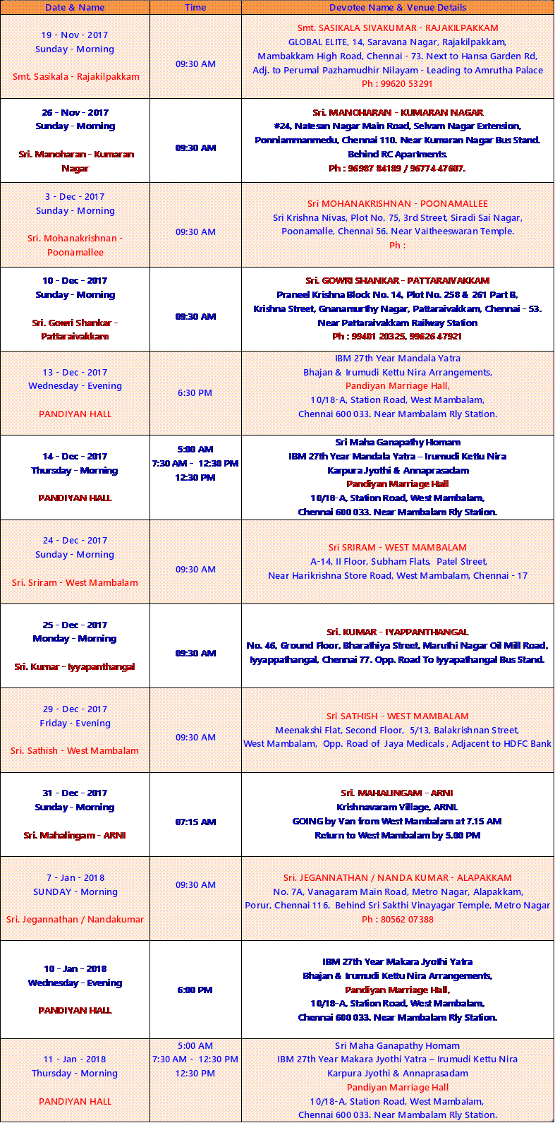 Mandalam Yatra - Irumudi Kettu Nira Arrangements Pandian Marriage Hall, 10/18-A, Station Road, West Mambalam, Chennai 600 033. Near Mambalam Rly Station. |