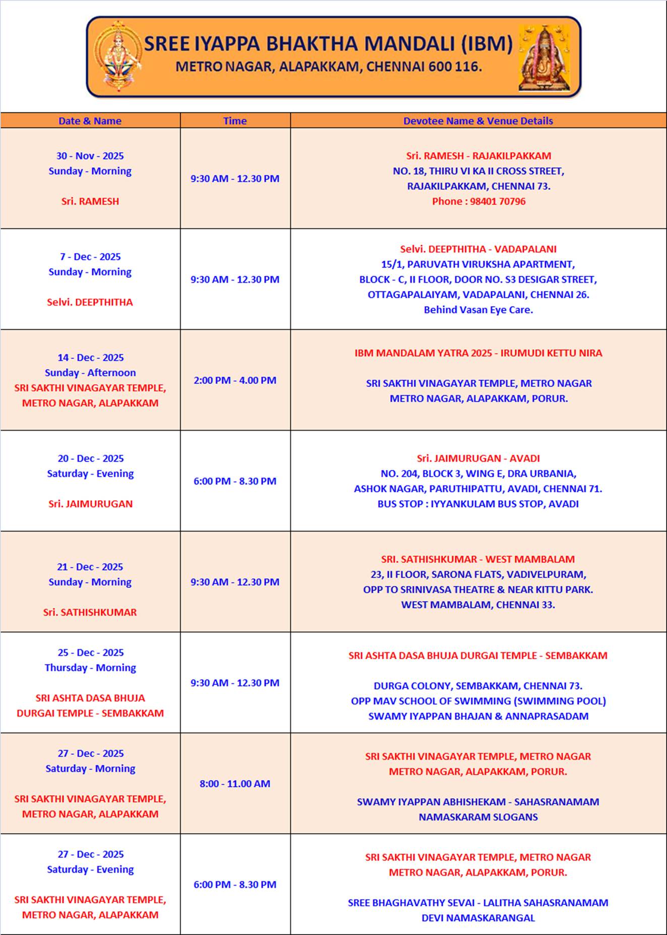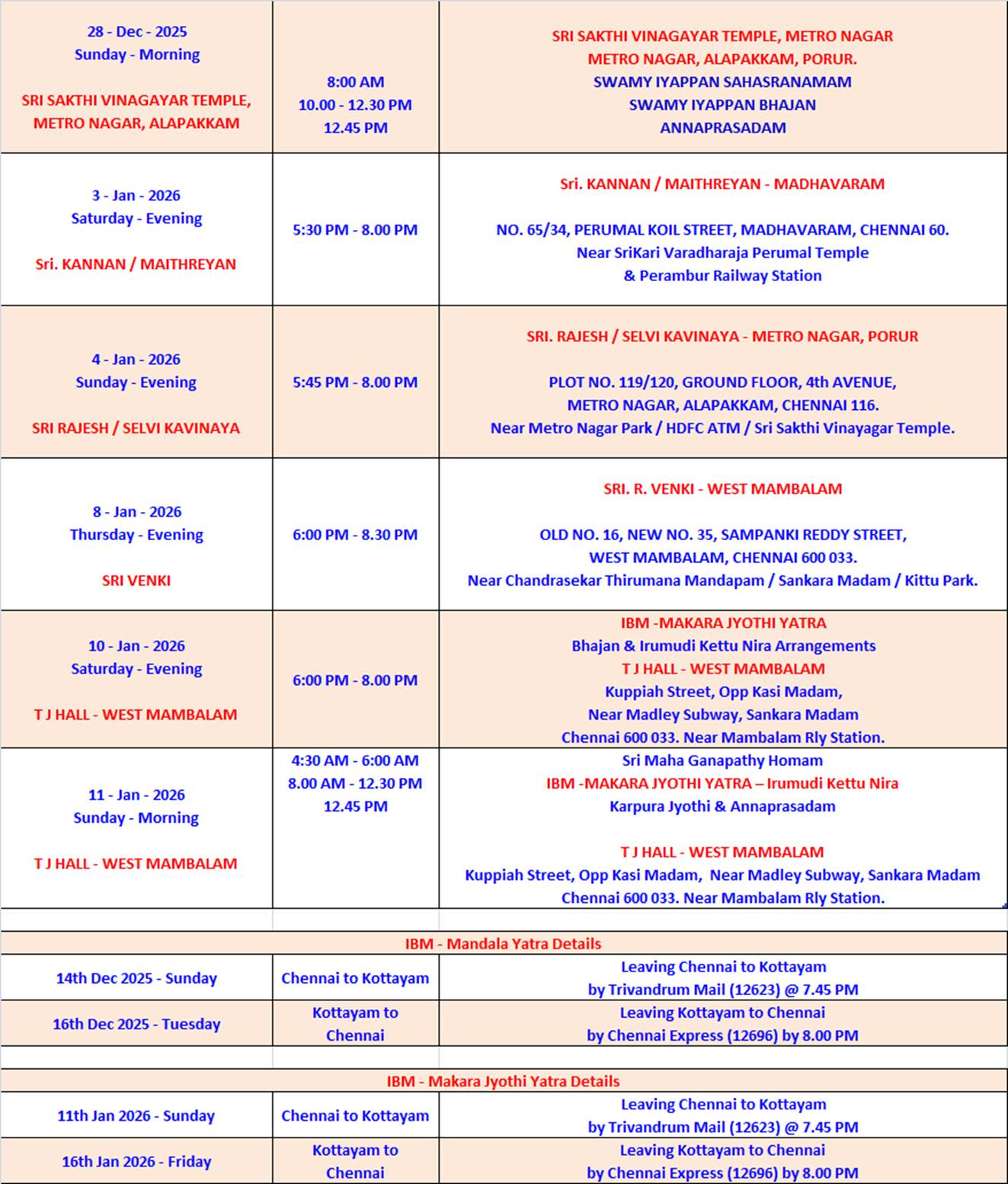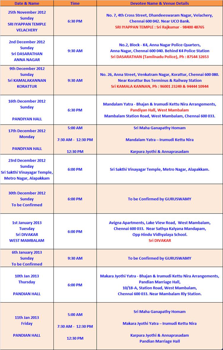 Mandalam Yatra - Irumudi Kettu Nira Arrangements Pandian Marriage Hall, 10/18-A, Station Road, West Mambalam, Chennai 600 033. Near Mambalam Rly Station. |